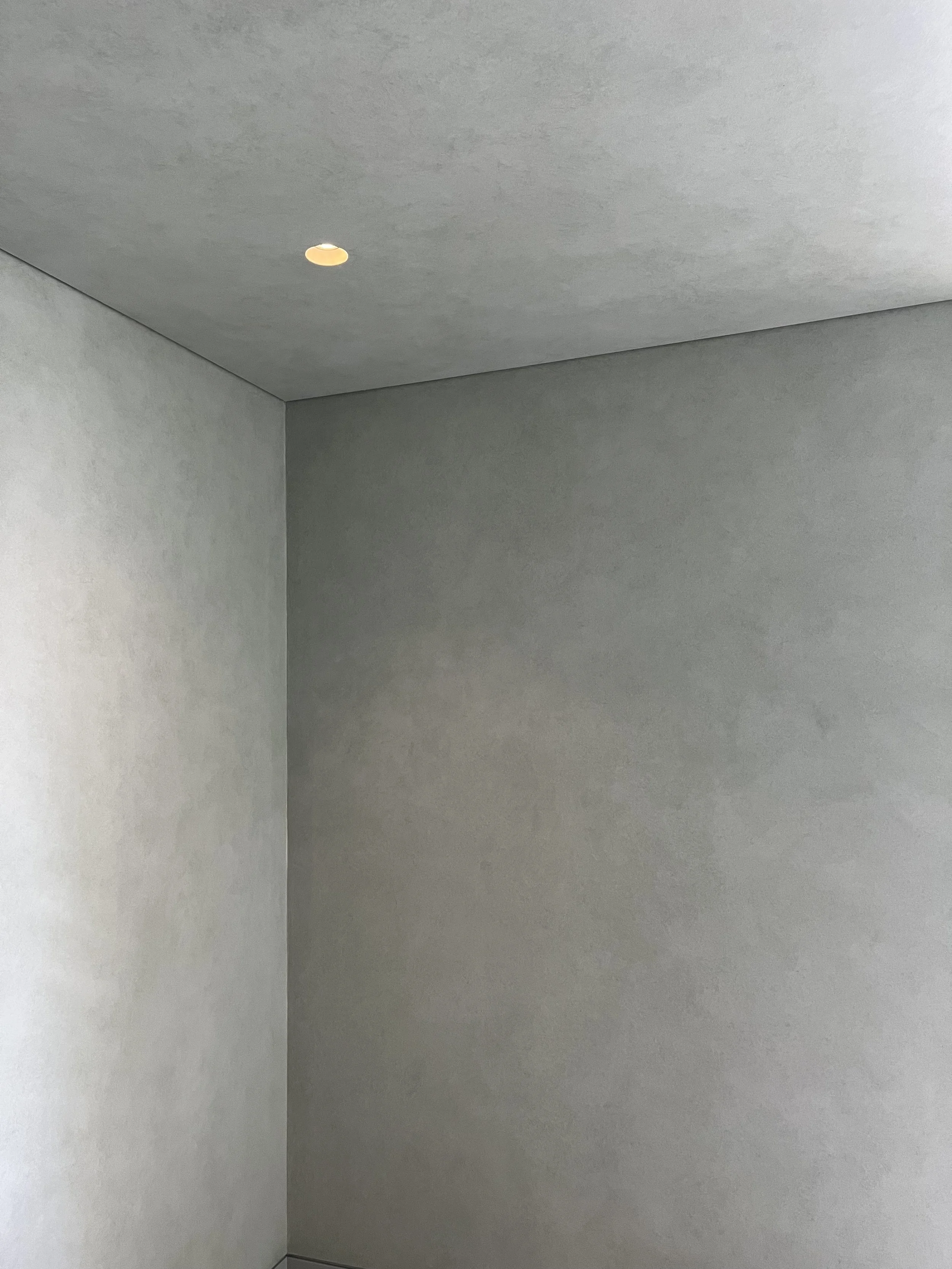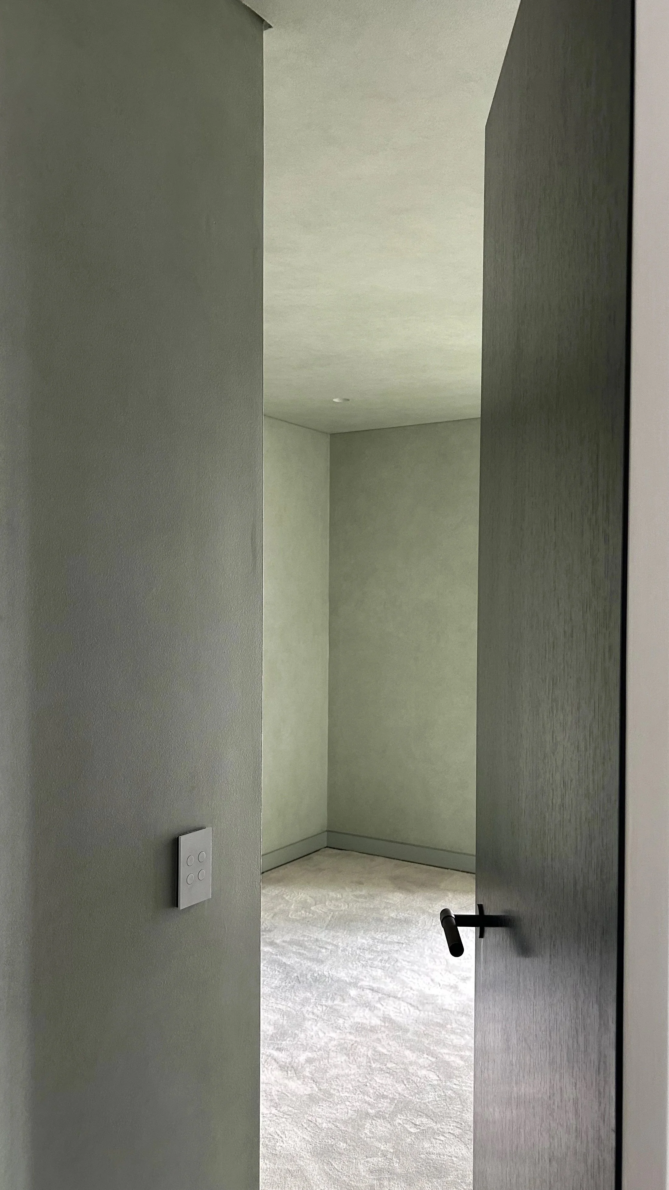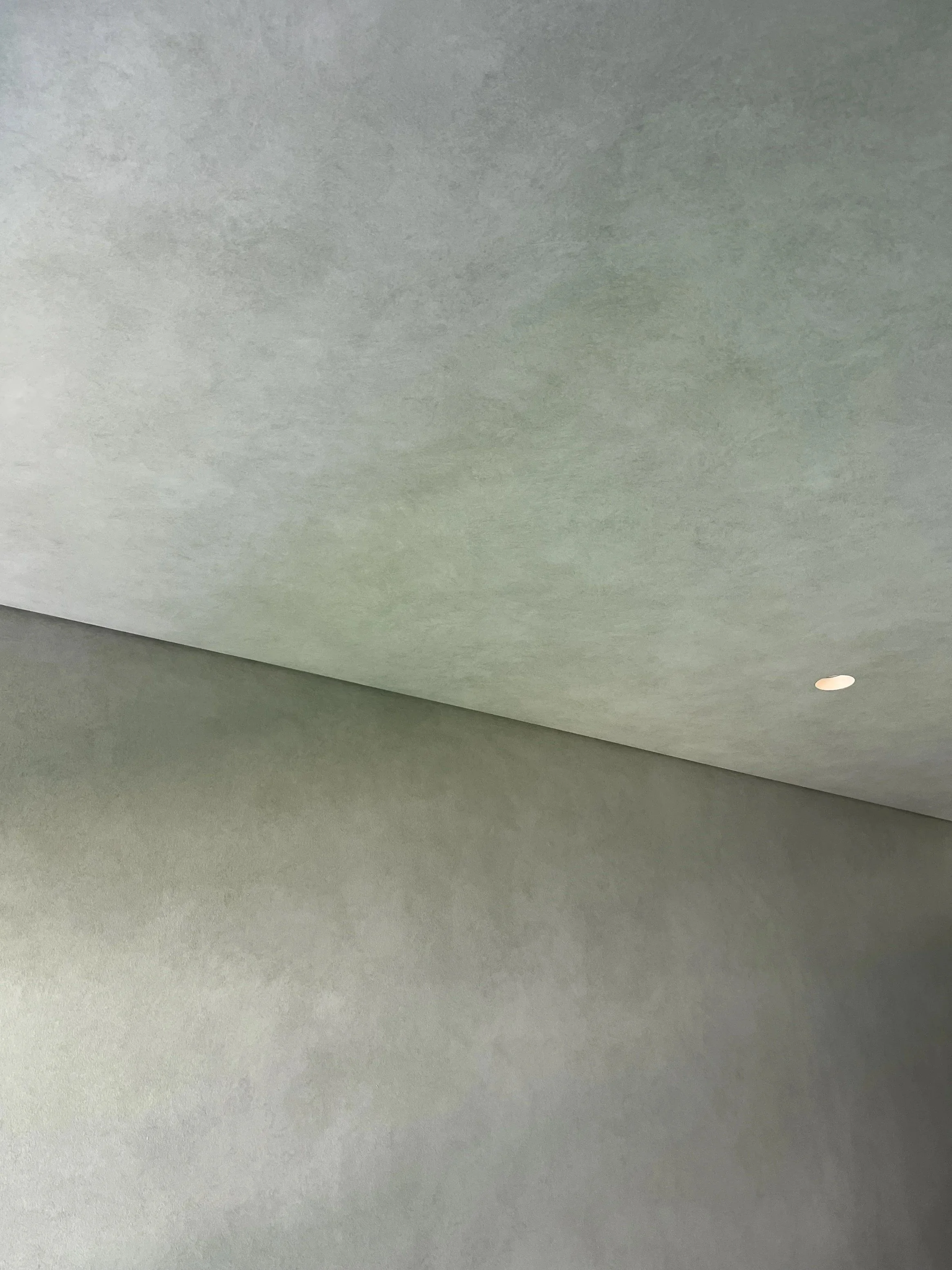 A continuous custom tinted lush French wash finish enveloping ceilings and walls for a seamless and sophisticated look.